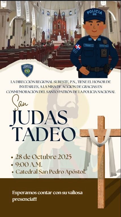 La Dirección Regional Sureste, P.N., comandada por el General Ramon E. Ramirez Encarnación, les invita formalmente a la celebración de la eucaristía en acción de gracias en conmemoración al día de San Judas Tadeo, Santo Patrón de Nuestra institución policial, la cual se llevara acabo el día de mañana Martes 28 de Octubre a las 9:00 horas, en la Catedral San Pedro Apostol de esta ciudad.